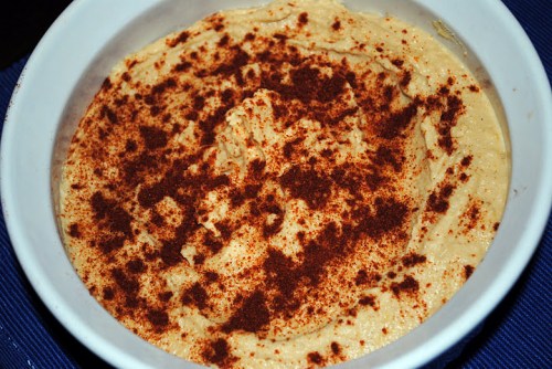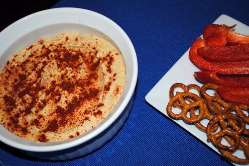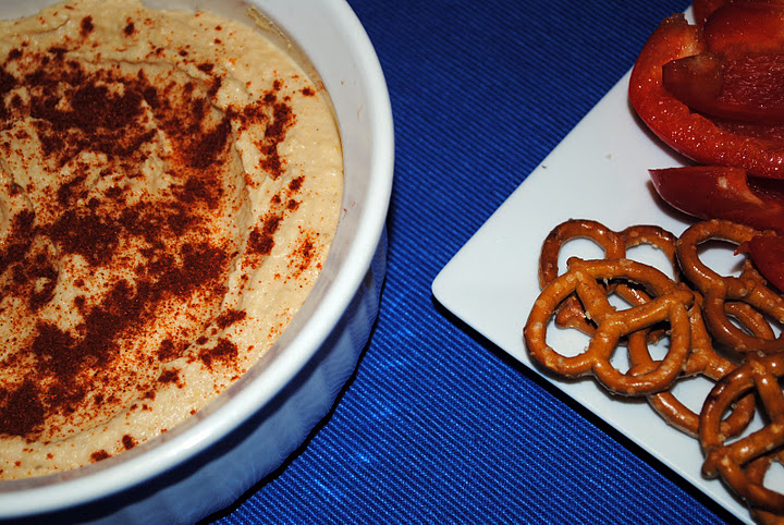 – Set aside 1/4 c of the liquid from the canned chickpeas. Dump the rest of the can into a colander and rinse. Deskin the chickpeas and place in food processor. Add the rest of the ingredients to the food processor and blend until smooth. Garnish with paprika if you want.