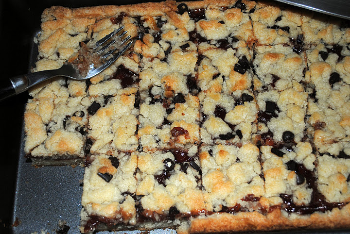 Press the remaining pecan mixture into the bottom of an ungreased 12×9-inch baking pan. Spread preserves to within 1/2 inch of the edges. Takes the remaining pecan mixtures and “sprinkle” onto preserves. As mine was not crumbly, I broke it into small pieces and dropped them on the preserves (see above picture).