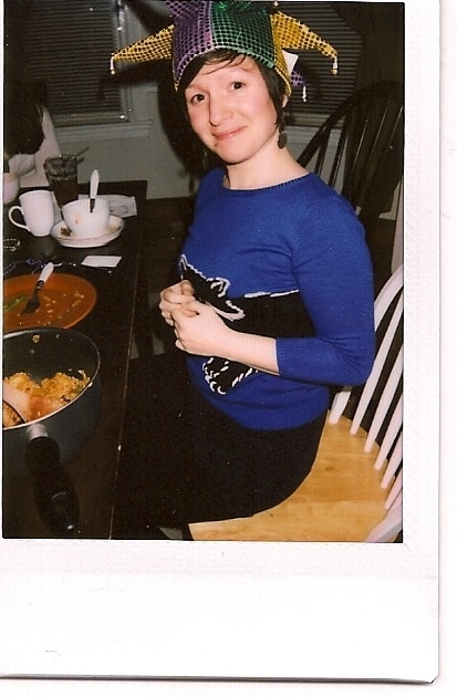 Jester Bonnie! The point of the King’s Cake is a small toy baby or uncooked bean is placed in the cake before it cooks and whoever finds the bean/baby gets the crown and to host the party next year. Bonnie won this year!! (I put a dried chickpea because a plastic baby in a 350 degree oven is weird.)