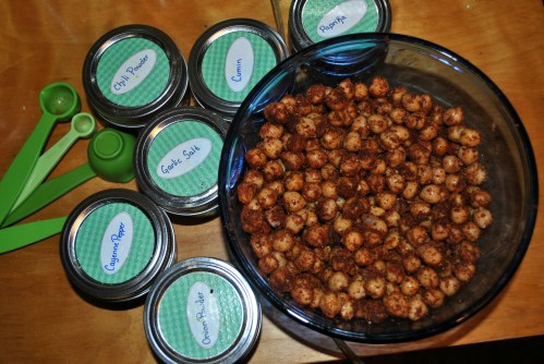 In a medium bowl, toss the chickpeas with all the seasonings. Coat a baking sheet in olive oil or cooking spray and place chickpeas on it. Bake for 13-15 minutes.