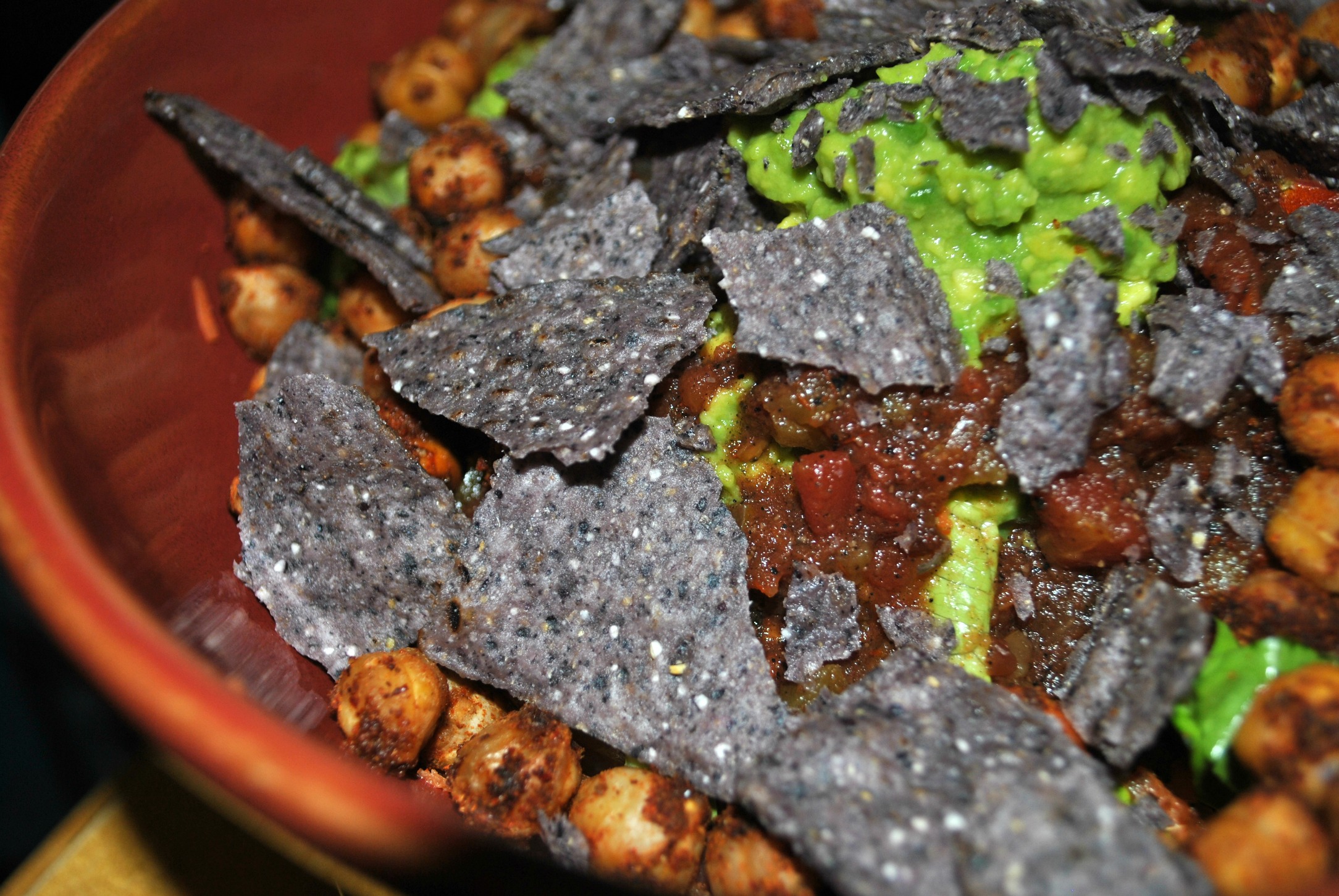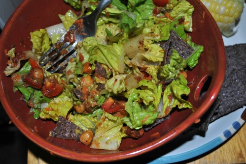 *This salad follows the Rabbit Food for My Bunny Teeth food pyramid break down: There’s two servings of veggies (lettuce, tomatoes, carrots and salsa), 1 serving of protein (chickpeas), 1 serving of healthy fat (avocado) and 1 serving of grains (tortilla chips). Because I’m counting the salsa as a veggy, I made sure that there was ONLY veggies in it. Also, because I’m counting tortilla chips as a grain (kind of a stretch), I looked for all-natural and minimal ingredients. Next time I will just bake my own but I was short on time this round. Feel free to use your favorite salsa and chips.