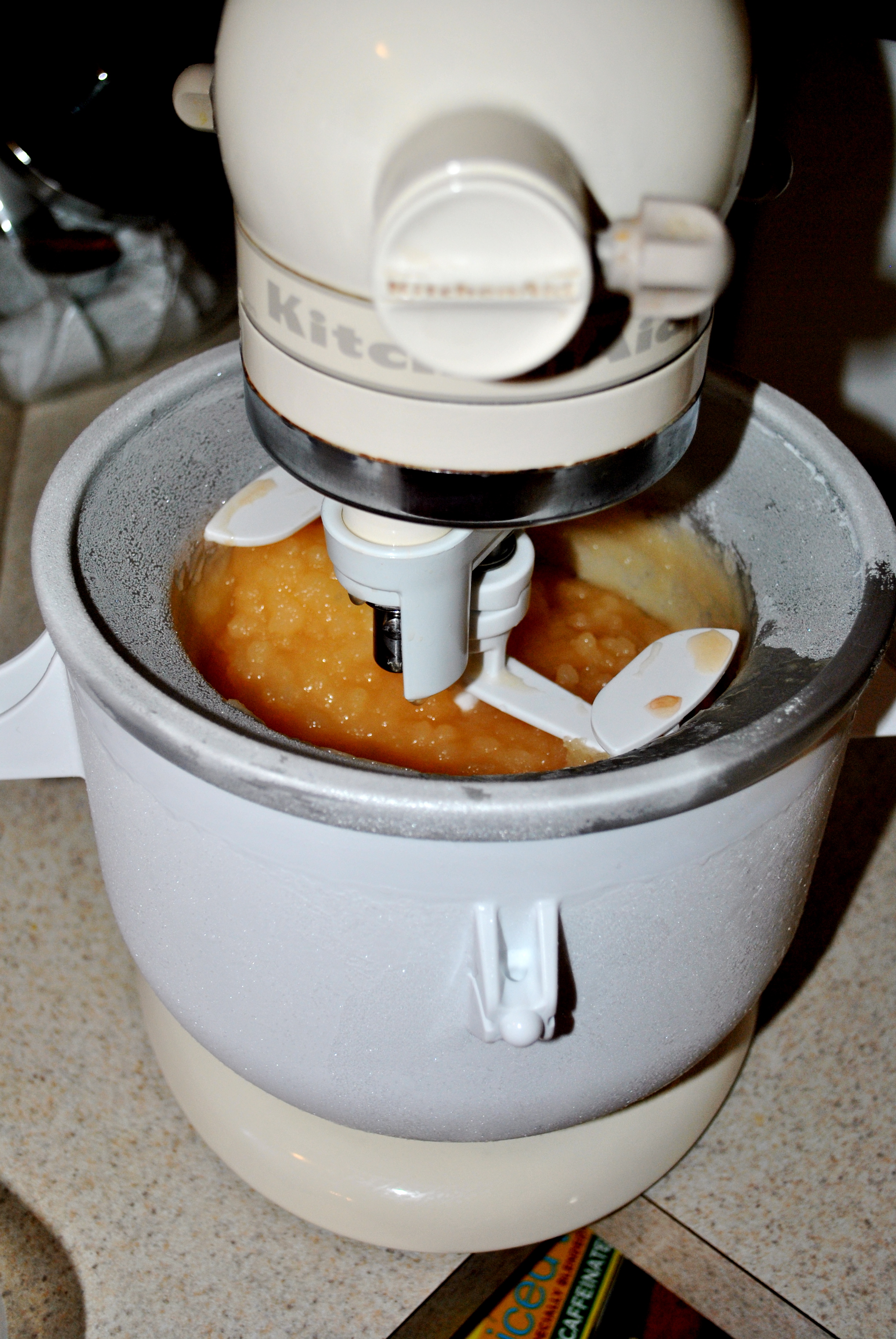Once chilled, pour the mixture in your ice cream maker and churn according to the directions. I used my mom’s KitchenAid attachment and churned it for 25 minutes. After churning, pour in a container and freeze for 6-8 hours until frozen.