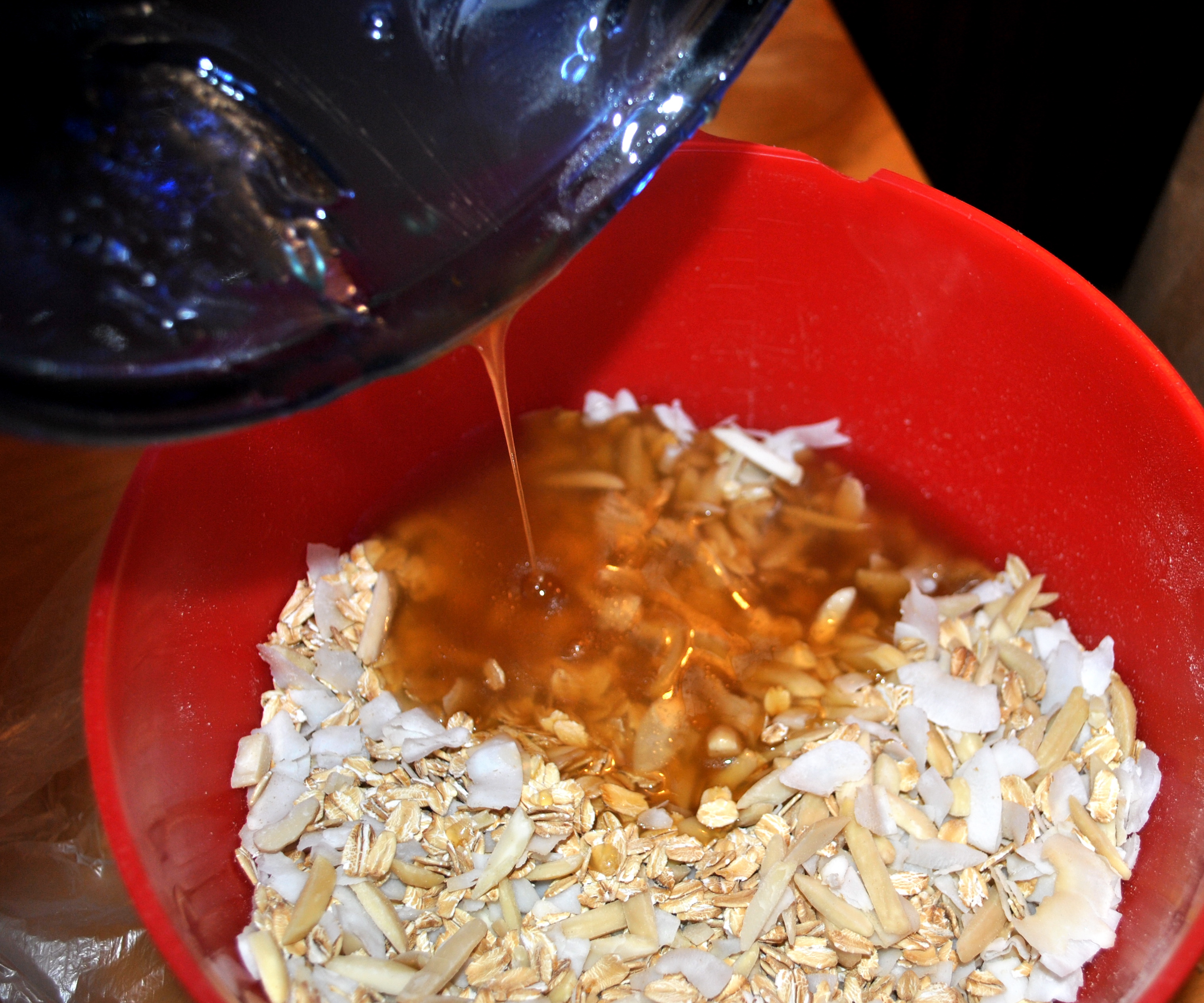 In a small bowl, whisk safflower oil, maple syrup and brown rice syrup.