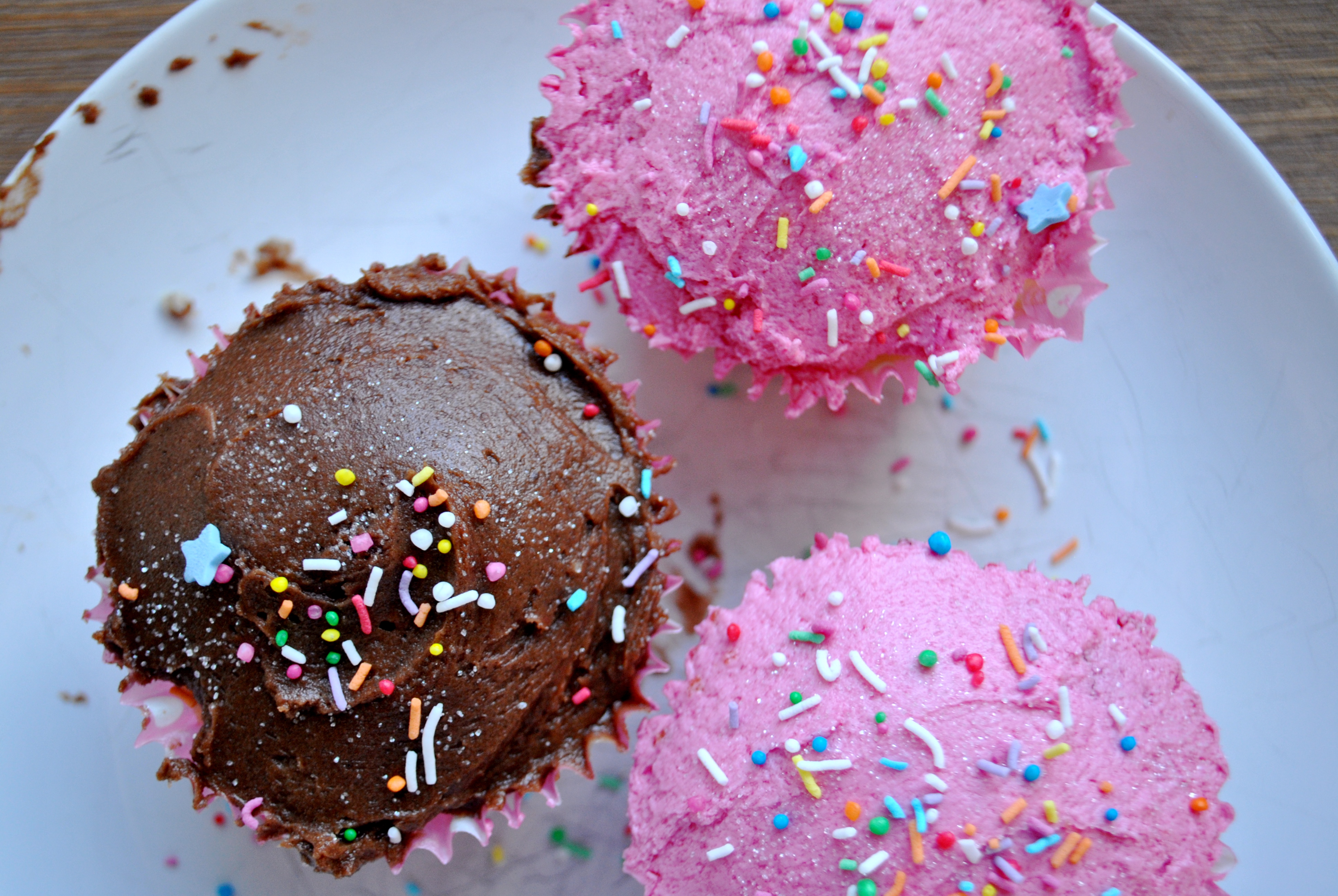 The cupcakes pictured are frosted with this Coconut Frosting, which I had left over, and some chocolate frosting from a left over cake that was made. All the strawberry frosting went onto the non-vegan cupcakes so I decided to use what I had instead of making a whole new batch. The vanilla cupcakes went beautifully with all of them but my favorite was definitely the strawberry.