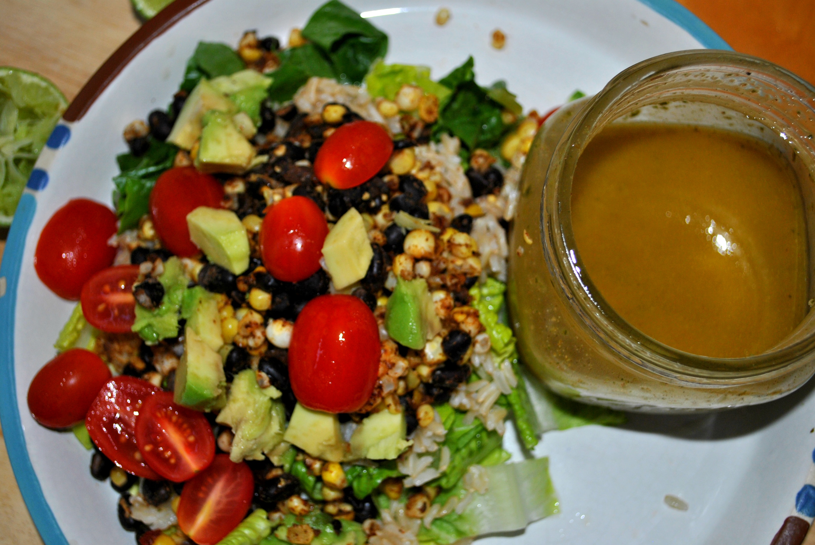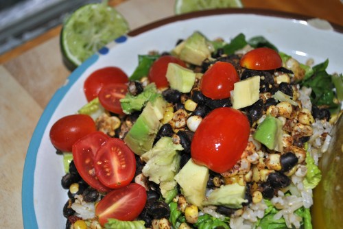 To assemble your salad, combine lettuce, rice, beans and corn mixture, tomatoes and avocado and drizzle with dressing.