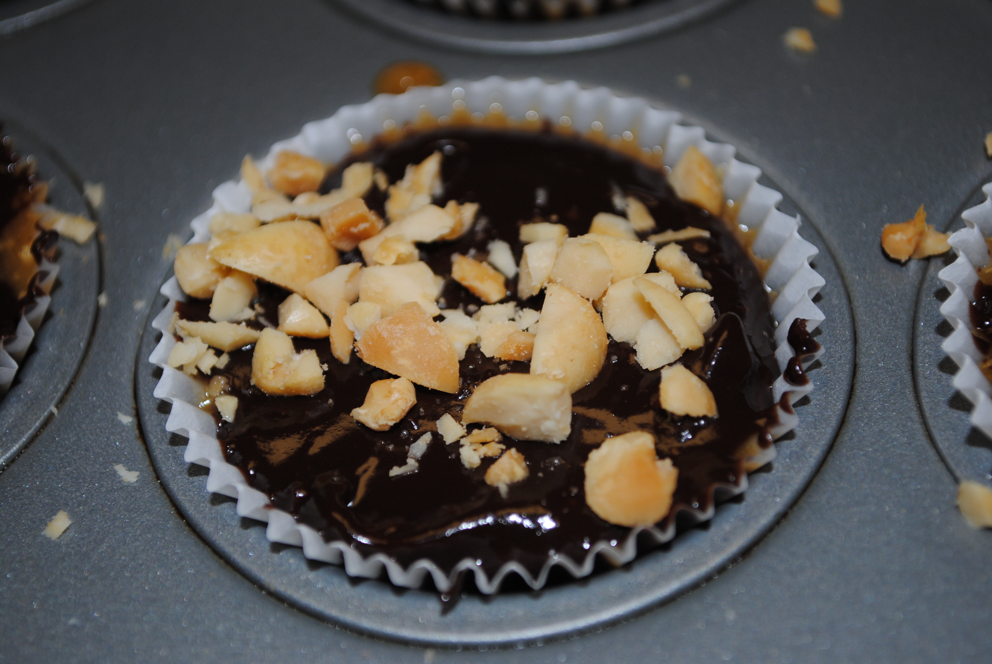 Evenly divide the mixture, approximately 2 tablespoons per cup (a little less then 1 TBS when going the mini muffin tin route. I felt 1 TBS didn’t allow enough room for the chocolate), among the muffin cups.