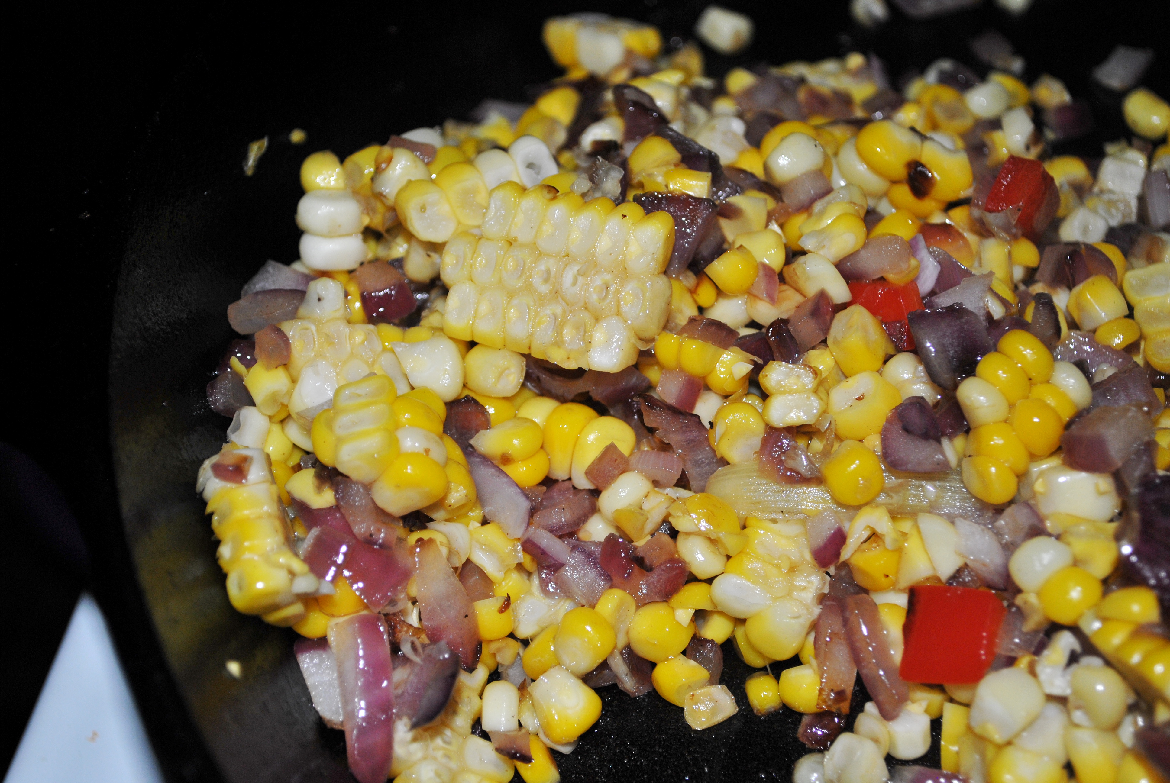 - Add the garlic and stir for 30 seconds then add the corn and cook for about 6-8 minutes, stirring frequently, until the corn starts to slightly brown and the onion is soft.