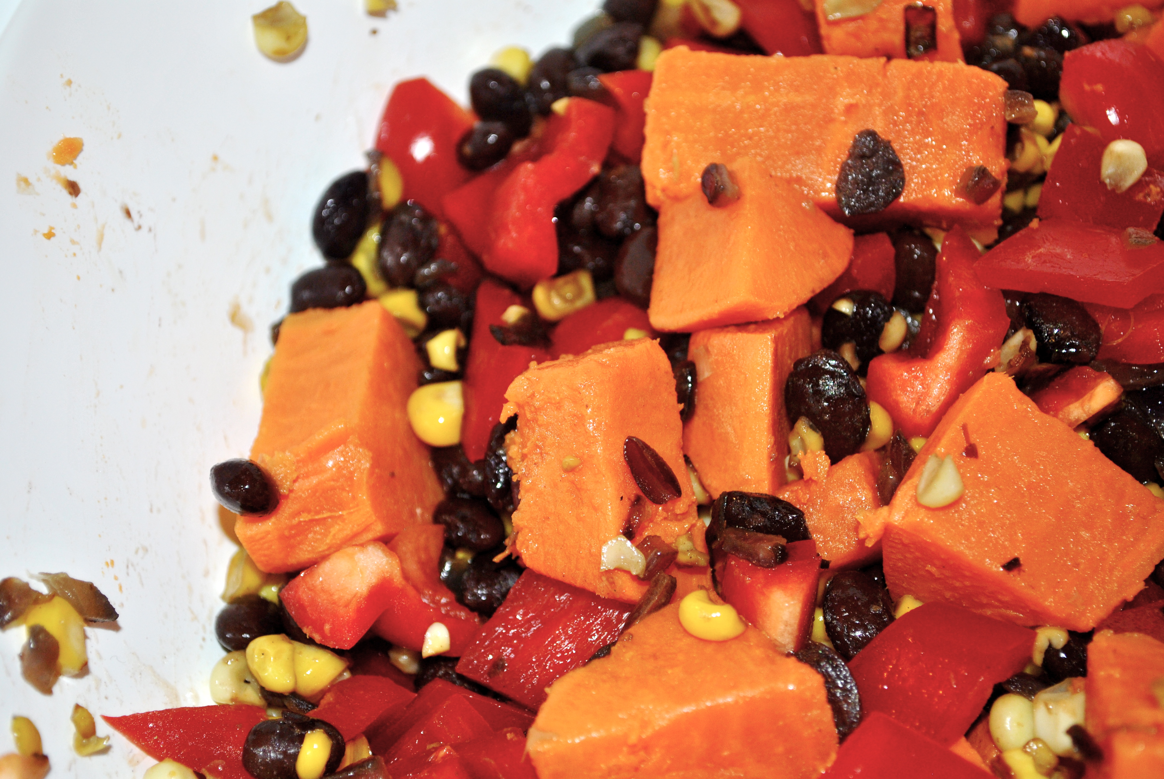 - Empty the sweet potatoes, black beans, bell peppers, and corn mixture into a large bowl.