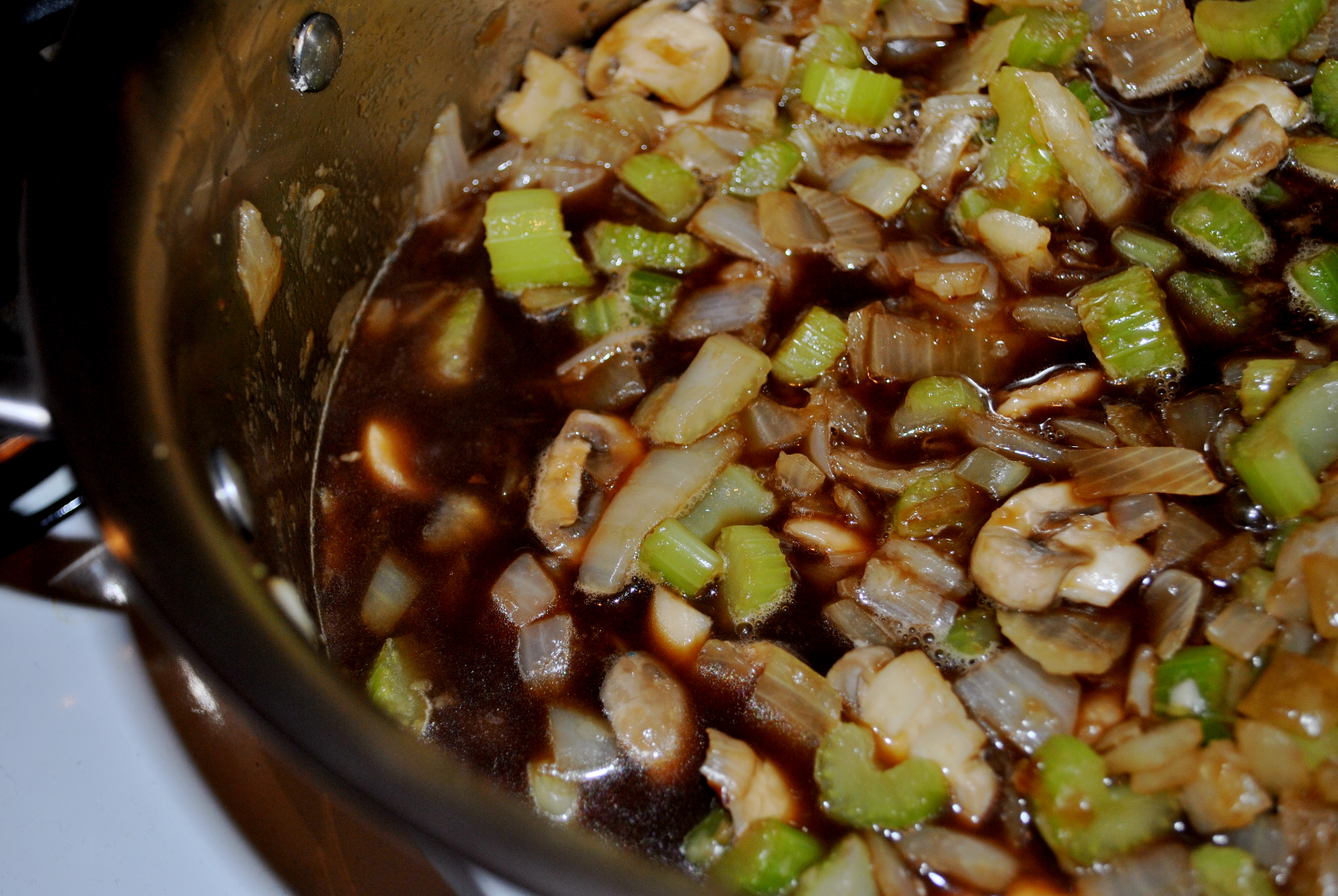 2. Add the onion, celery, and about 1/4 of the mushrooms, stirring frequently until softened, about 10 minutes.