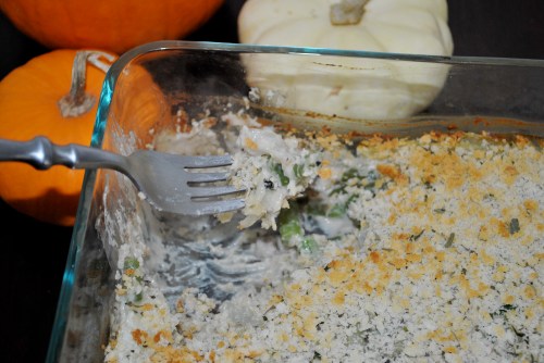 Place the green bean/mushroom mix into a casserole dish. Top with caramelized onions and panko crumbs. Place in a pre-heated 425 degreee oven and bake for 15-20 minutes, until the casserole is warmed through and the panko crumbs are golden.