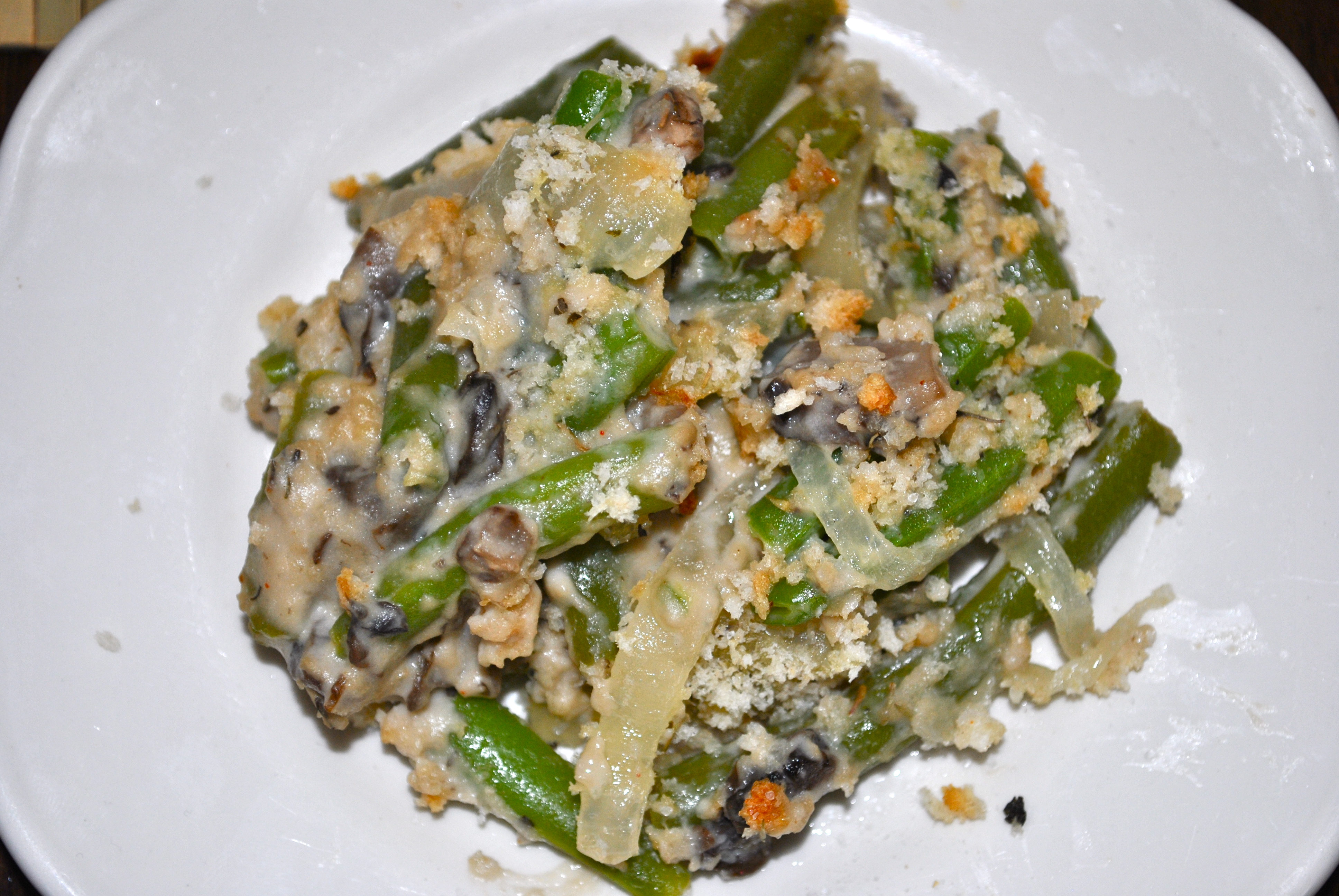 To make this the night before, follow the steps through placing the green bean/mushroom mix into a casserole dish. Cover and chill until prepared to serve. Right before placing this in the oven, top with caramelized onions (I cooked these the night before and kept in a separate bowl until ready to put on casseroel) and panko mix. Cook for 15-20 minutes at 425. If you find that the mixture has turned too solid in the fridge over night, pour a little bit of soy milk on the green bean mixture, stir it around, then top with onions and panko.