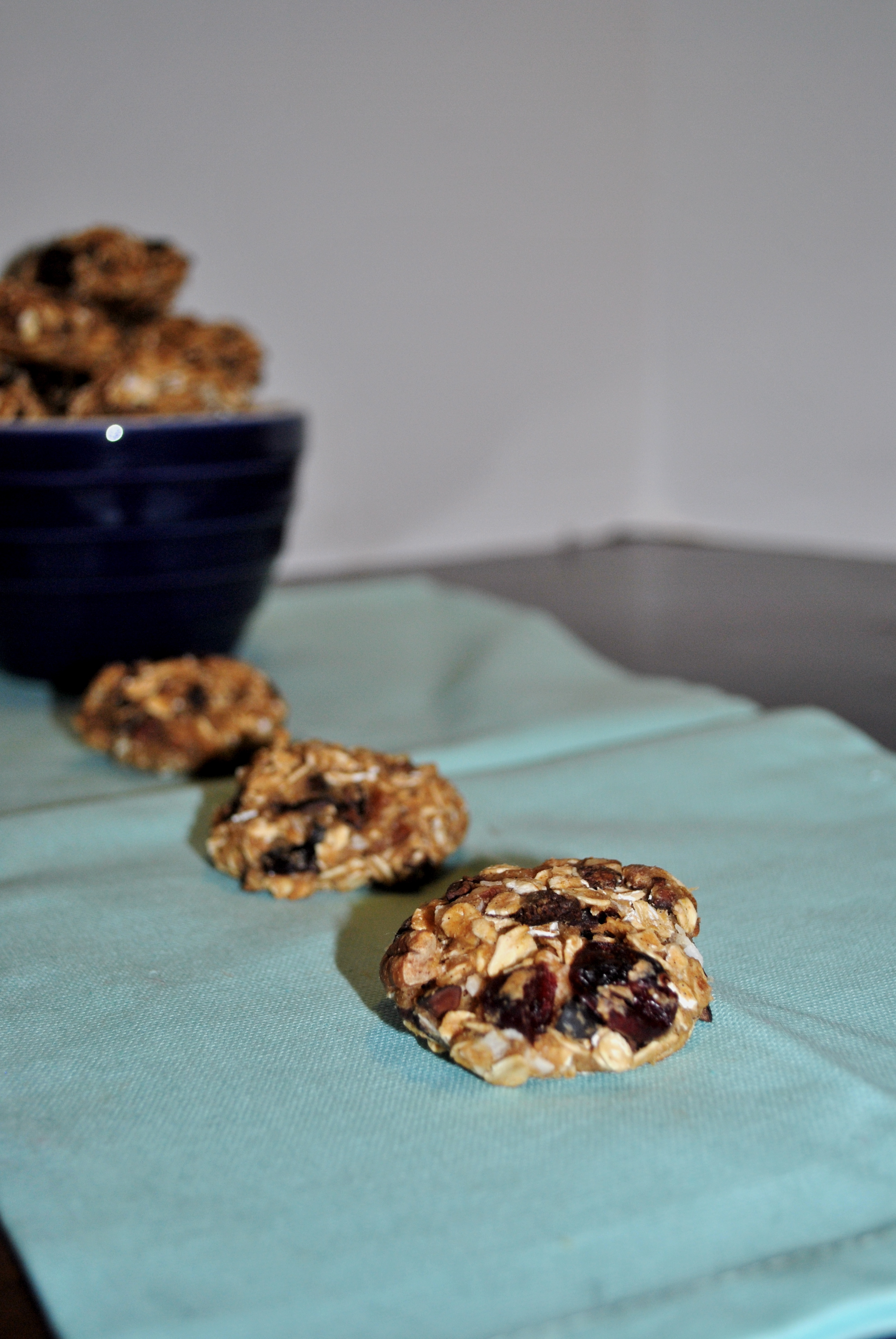 One of the hardest things I have found when attempting to eat healthy over the past year or so is that sugar and snacks are SO hard to cut out of your diet. I wanted to make these “cookies” as hearty and as healthy as possible while still fooling my brain into thinking it’s snacking. So I did my best to eliminate the extra sugar from this recipe by using unsweetened apple sauce, coconuts and craisin. I also tossed the chocolate chips and used roasted cacao nibs. I will be honest- these definitely aren’t going to replace chocolate for me, they definitely don’t taste like a chocolate chips and they aren’t that great plain. BUT, I found they gave enough of a chocolate hint when cooked into the cookies to fool my brain without over powering the other ingredients. Cooking them into the cookies took away a lot of the bitterness. I want to try the semi-sweet chocolate baking squares next time.