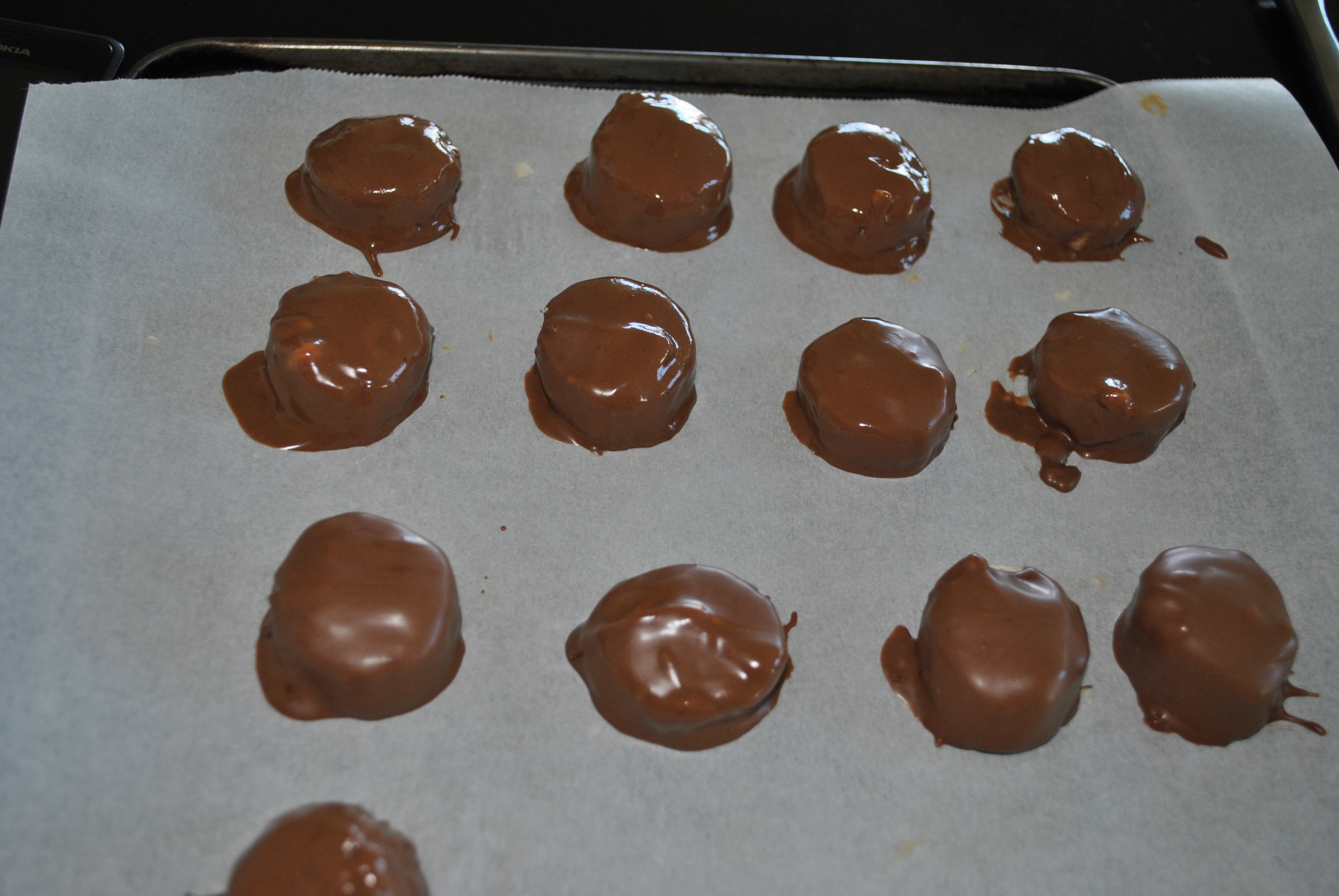 8. Place in the fridge or freezer for another 10 minutes or so for the chocolate to harden. Keep chilled.